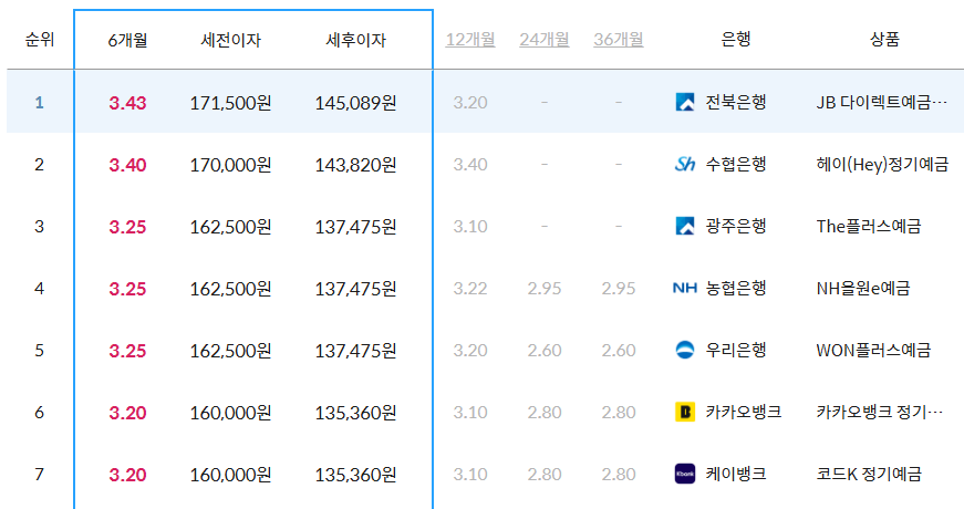 - 전북은행 JB 다이렉트예금: 금리 3.43%, 세후이자 145,089원